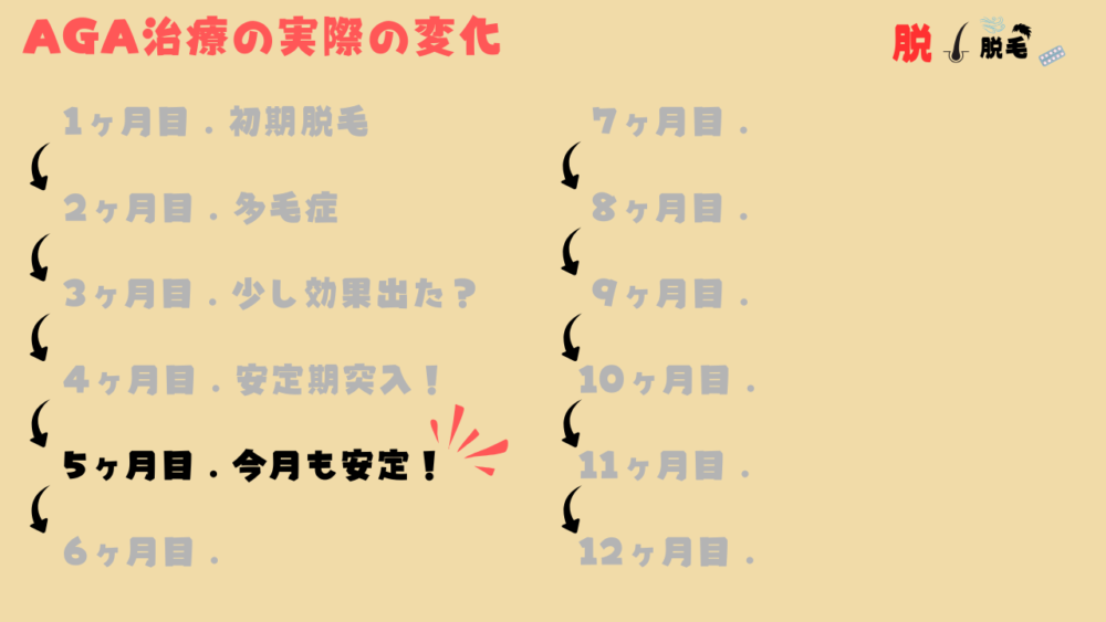 4ヶ月目に安定期に入り、5ヶ月目の特に変化なく安定した状態が続いていました。
