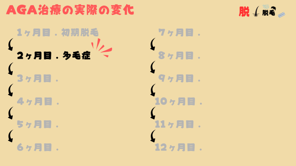 - 2ヶ月目:体毛が増えるなどの副作用を感じる