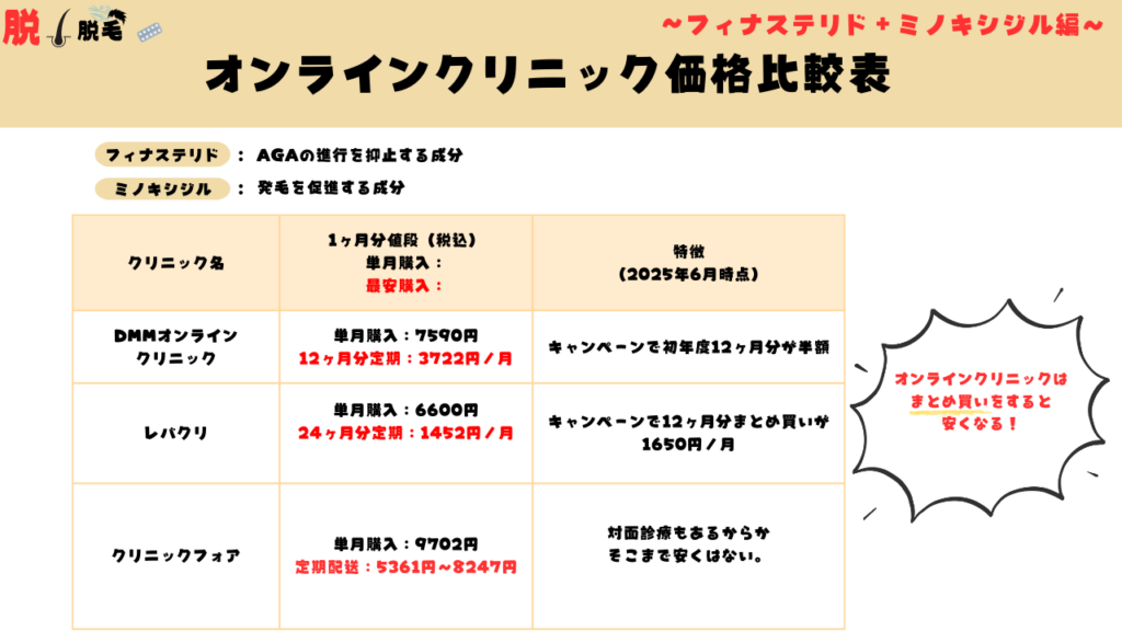 オンラインクリニックの特徴を一言で言うなら、『値段はネット通販寄り、安全性はAGAクリニック寄り』です。