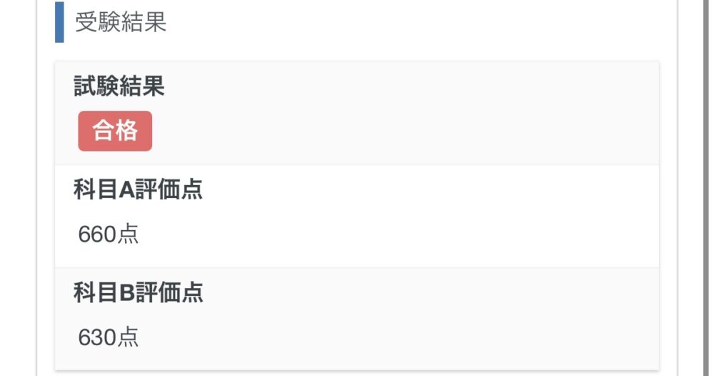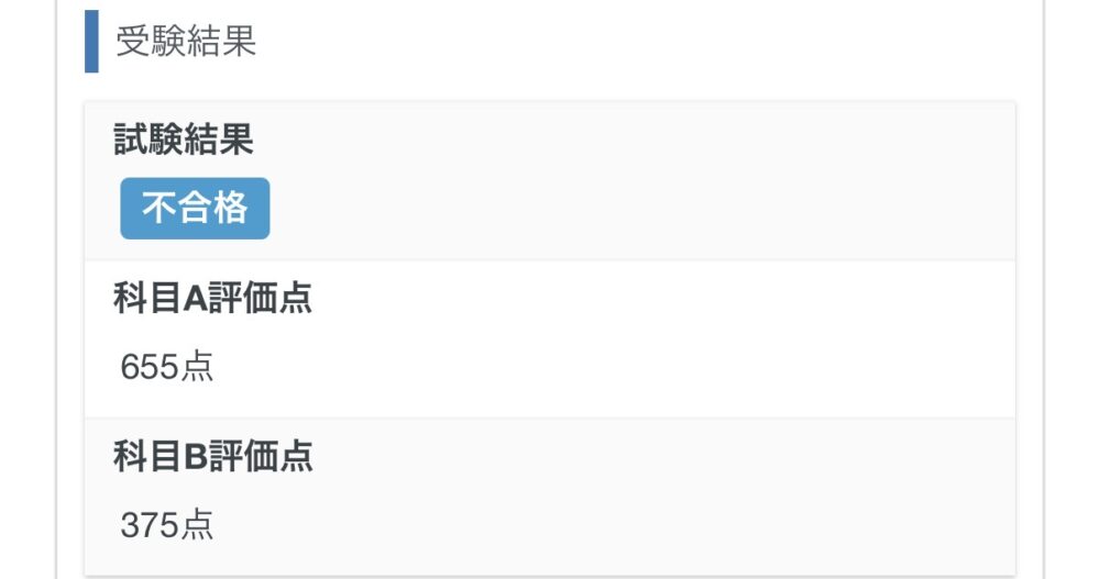A科目は655点で合格。一方でB科目は375点と不合格でした。